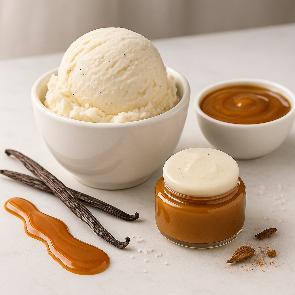 Indulge in the rich aroma of velvety vanilla bean ice cream drizzled with warm, salted caramel. This gourmand fragrance is a decadent blend of whipped buttercream, sweet spiced balsam, and the comforting warmth of tonka bean and vanilla, creating an irresistibly creamy and indulgent scent.