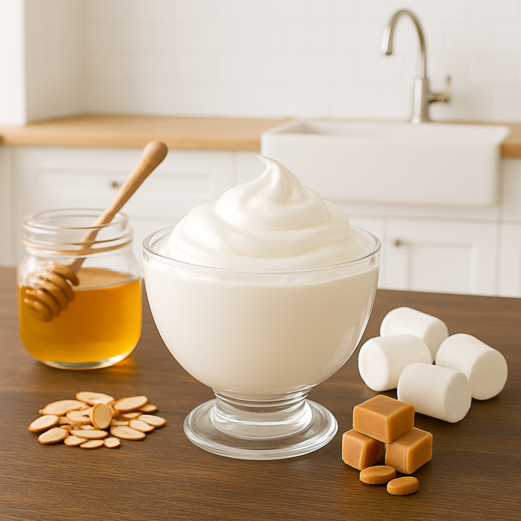 Fluffy marshmallow crème swirled with golden honey, toasted almonds, and a rich touch of warm vanilla caramel. Sweet, smooth, and decadently comforting.